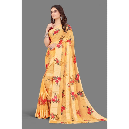 pkrkart Women's Georgette Printed Saree With Unstitched Blouse (Yellow)