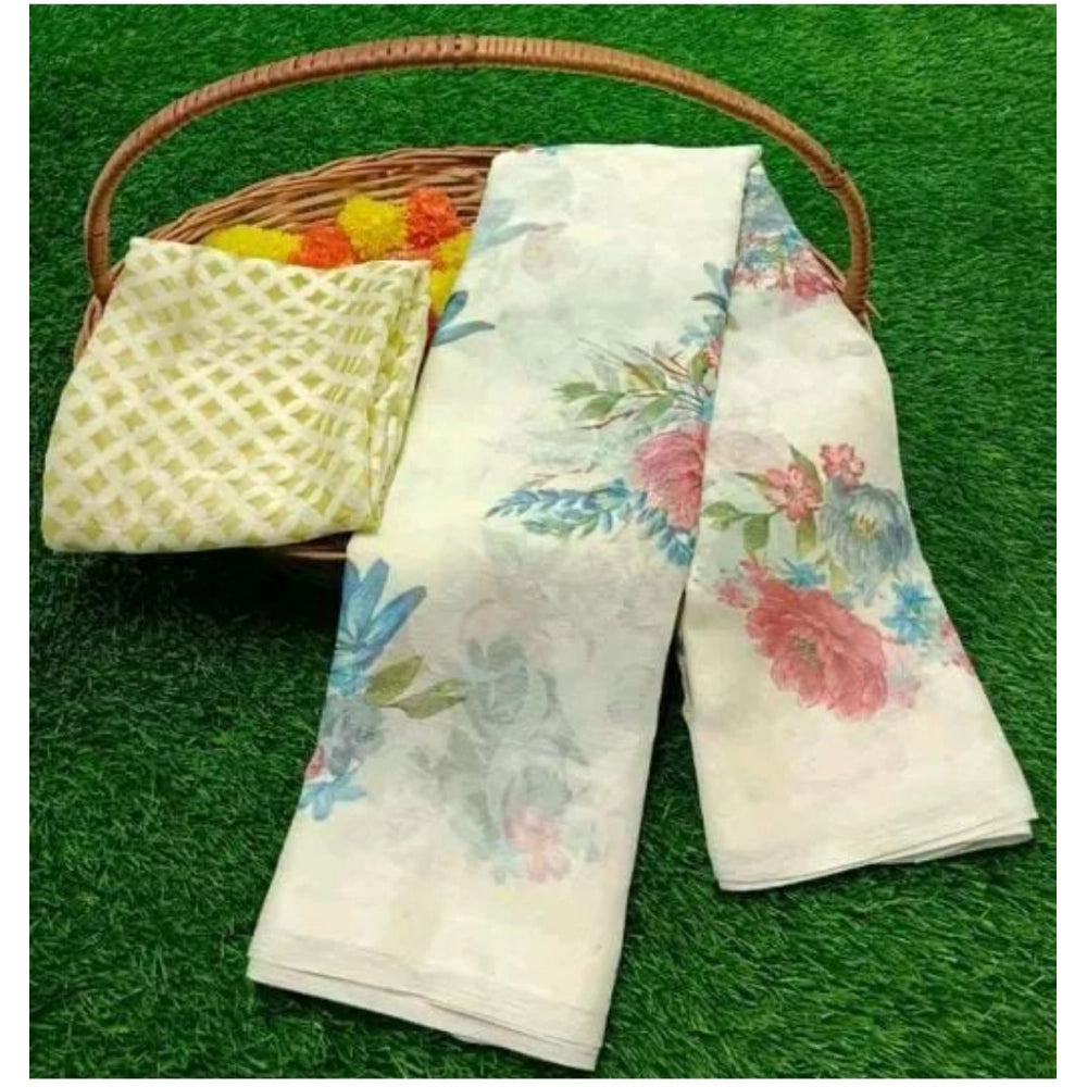 pkrkart Women's Viscose Rayon Printed Saree With Unstitched Blouse (Cream)